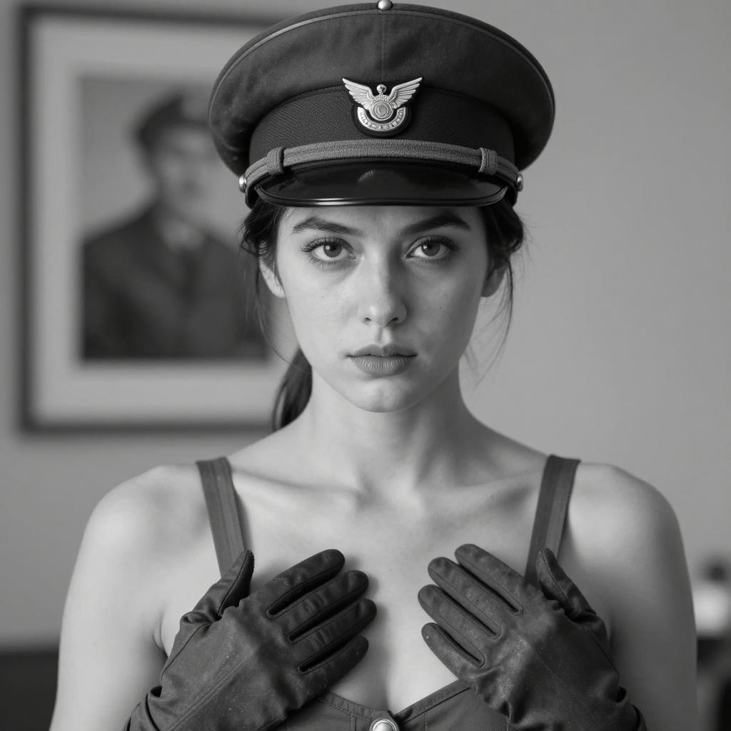 Black-and-white photograph of a woman with fair skin, wearing a dark military-style peaked cap with a wing emblem and dark elbow-length gloves. She has dark hair pulled back, wears a strapless top with thin straps, and her hands are on her bare chest. Background includes a blurred framed picture. Intense, direct gaze.