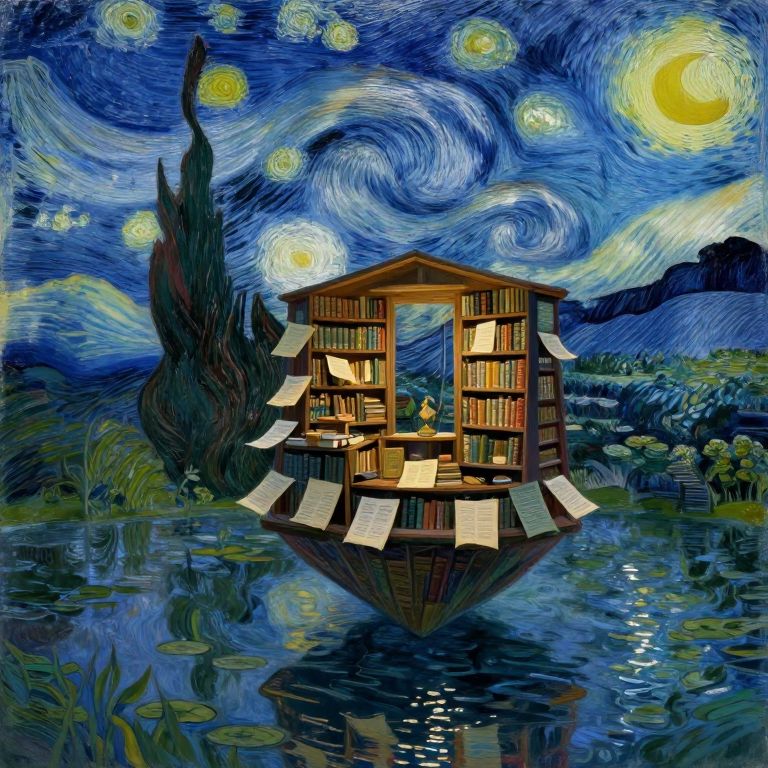Digital painting of a woman in a white dress standing on a glowing chessboard under a swirling, starry night sky with Vincent van Gogh's "