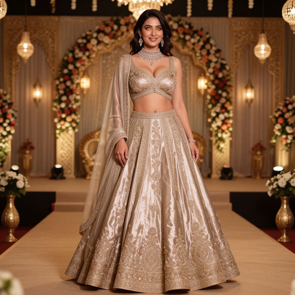 A stunning woman with glowing amber eyes and smooth, warm skin wears a luxurious fancy satin lehenga costume, its rich, flowing fabric shimmering in soft golden light. She stands gracefully on a traditional Indian wedding stage adorned with floral arches and twinkling lanterns, her smile radiant and confident. The costume has intricate embroidery, a high neckline, and layered train that drapes elegantly on a grand festival backdrop.. The woman has big tits and cute face