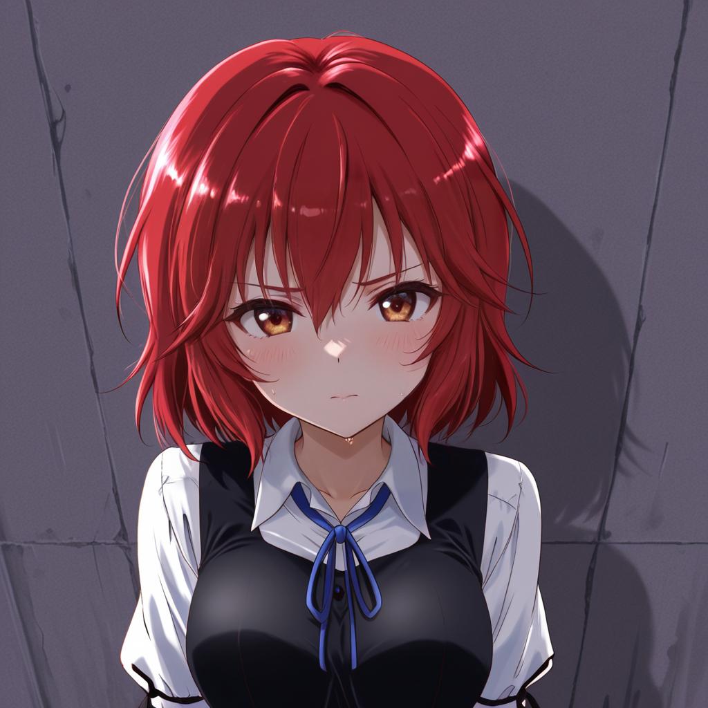 Digital illustration of an anime-style girl with short red hair and brown eyes. She is wearing a white shirt under a black vest with a blue ribbon tie. The character appears against a muted gray background, showcasing a solemn facial expression. The art style is detailed, with polished shading and highlights, influenced by the artist Urutsu Sahari.