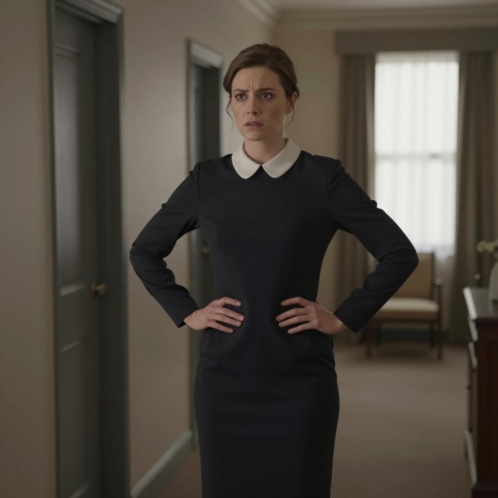 Woman in a dark, long-sleeved dress with a white collar stands in a dimly lit hallway, hands on hips. Background includes doors, carpeted floor, and a chair near a window with curtains. Neutral, slightly concerned expression. Photo.