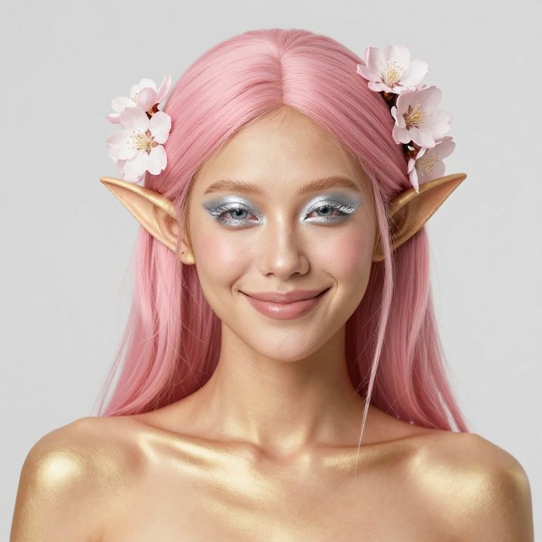 Minimalist Fashion photorealistic portrait of a female elf with light pink hair, golden skin, and silver mischievous eyes. she has a friendly smile and blossoms in her hair,
