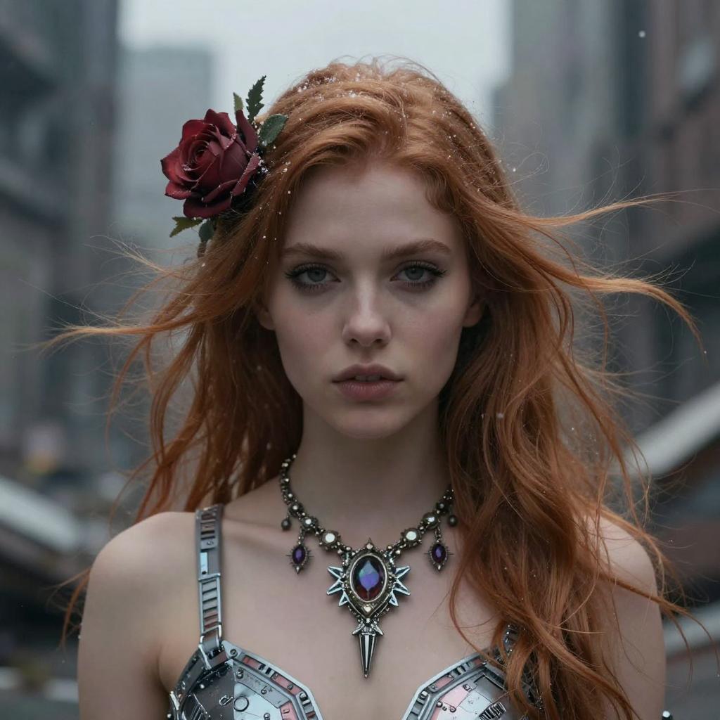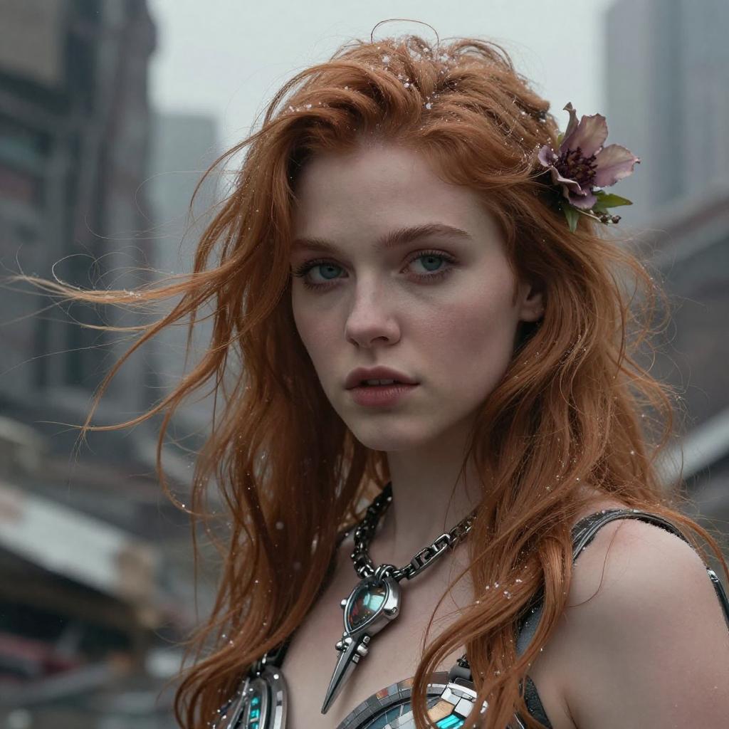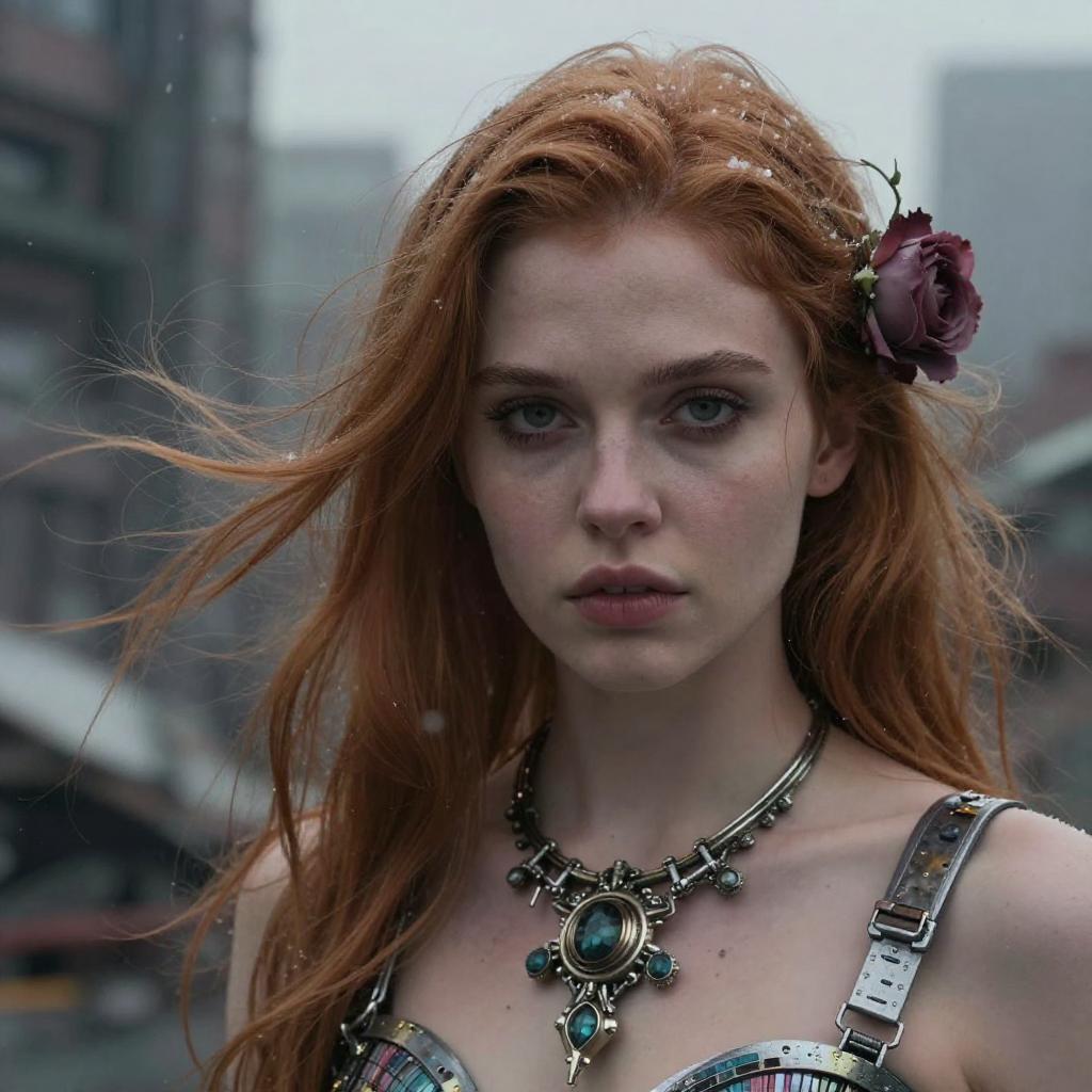 Realistic photography, closeup of beautiful woman with friskles and, head shot, 25yo, focus on eyes, 50 mm f1.4, ginger hair in wind, hdr masterpiece, dramatic lighting, epic, cyber dress, flower in hair, light snowing, post apocalyptic city, epic necklace