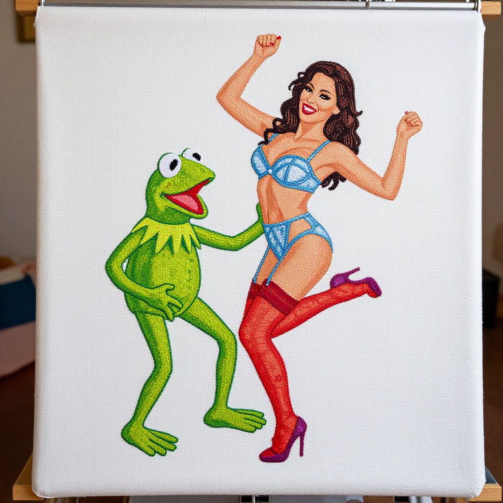 Embroidery Machine /imagine prompt: woman in lingerie including garters and stocking dancing for Kermit the Frog, photo,
