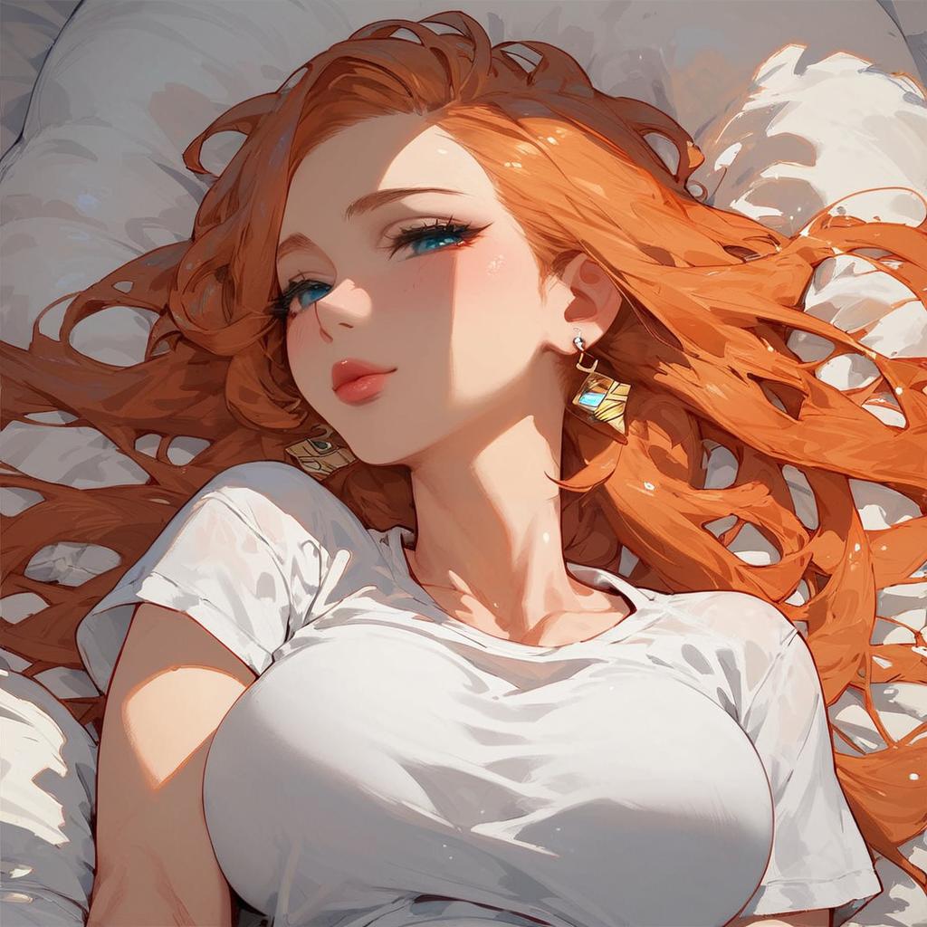 Digital illustration of a beautiful, fair-skinned woman with long, wavy, vibrant red hair lying on a white pillow. She has striking blue eyes, full pink lips, and wears a white, short-sleeved, slightly tight-fitting shirt that accentuates her large breasts. She also wears gold, geometric-shaped earrings. The bright sunlight casts shadows across her face and hair, adding depth to her features. The background consists of soft, white pillows, enhancing the intimate and relaxed setting. The art style is semi-realistic with a focus on bold colors and clean lines.