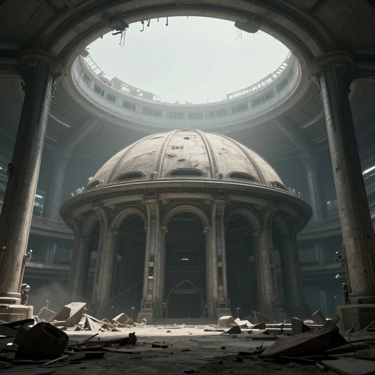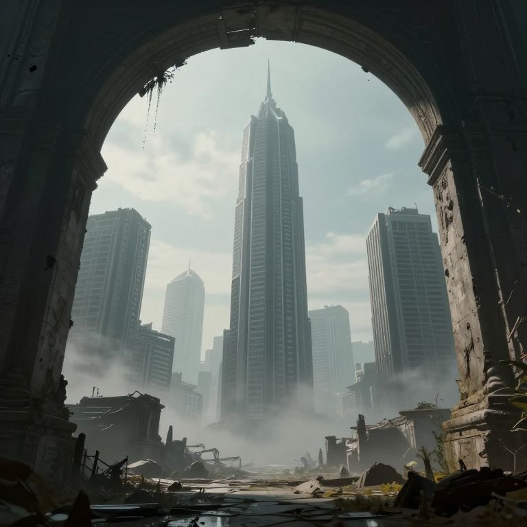 A cyberpunk-inspired 3D render depicts a hauntingly atmospheric scene where futuristic skyscrapers loom over ancient stone archways, their silhouettes shrouded in mist, evoking a sense of timelessness and decay amidst the remnants of a bygone era.