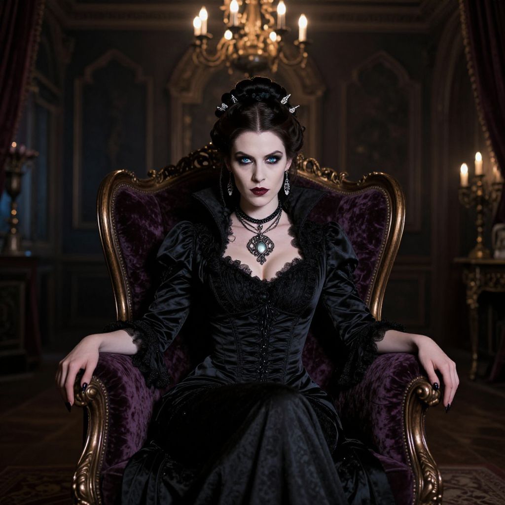 Victorian vampire woman seated in a luxurious velvet armchair inside a shadowy mansion, gothic chandeliers casting dramatic shadows, her eyes shining with supernatural intensity, elegant hairstyle with jeweled pins, a mix of Victorian refinement and vampiric mystery.