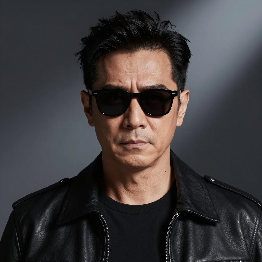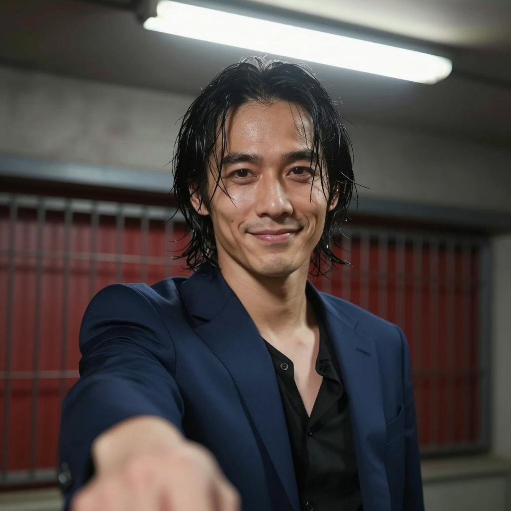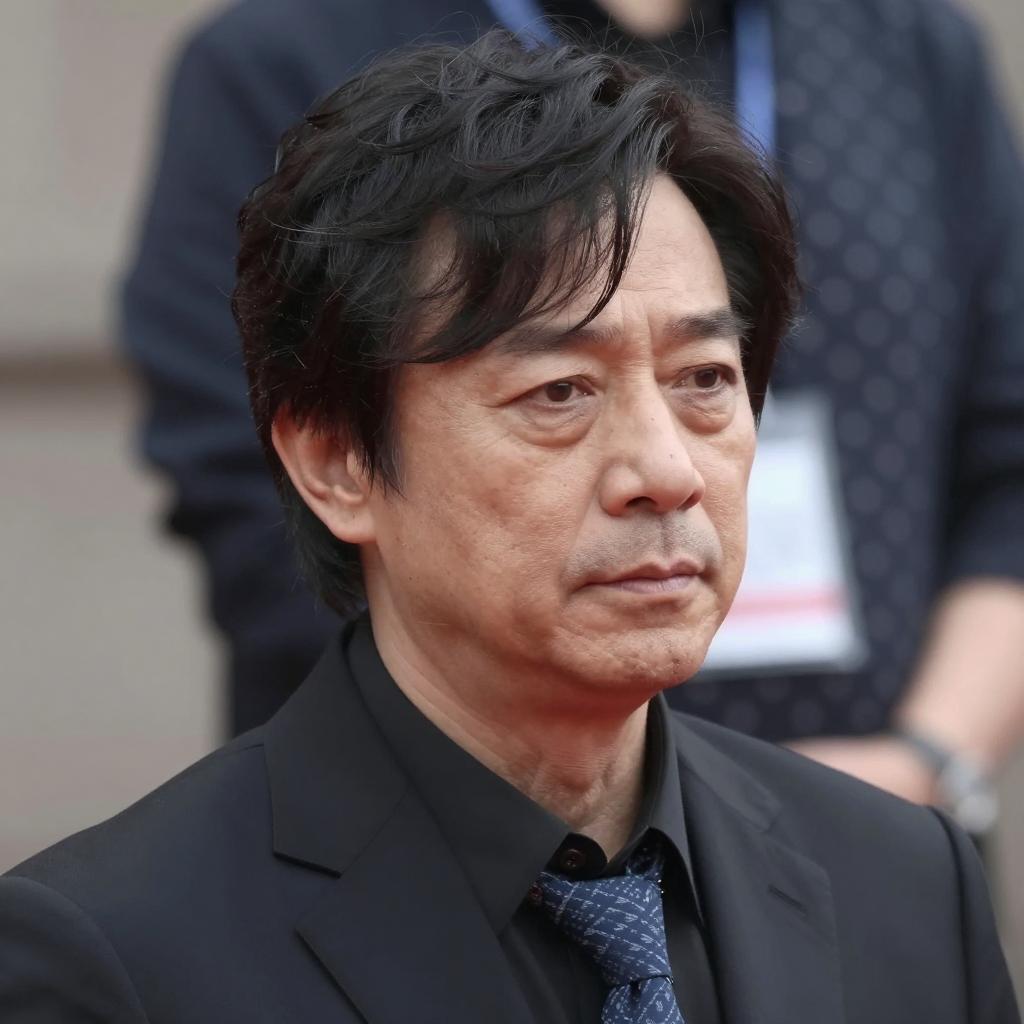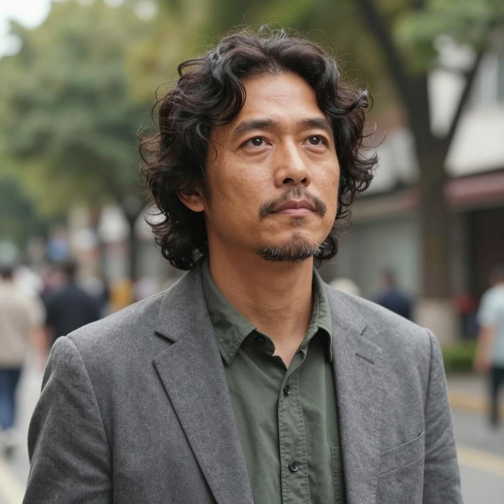 A man with medium brown skin, medium-length dark curly hair, and a light goatee. He wears a gray blazer over a green shirt, looking slightly upwards with a neutral expression. Background includes green trees and a blurry street scene with people. The man is centered, slightly tilted to the right.