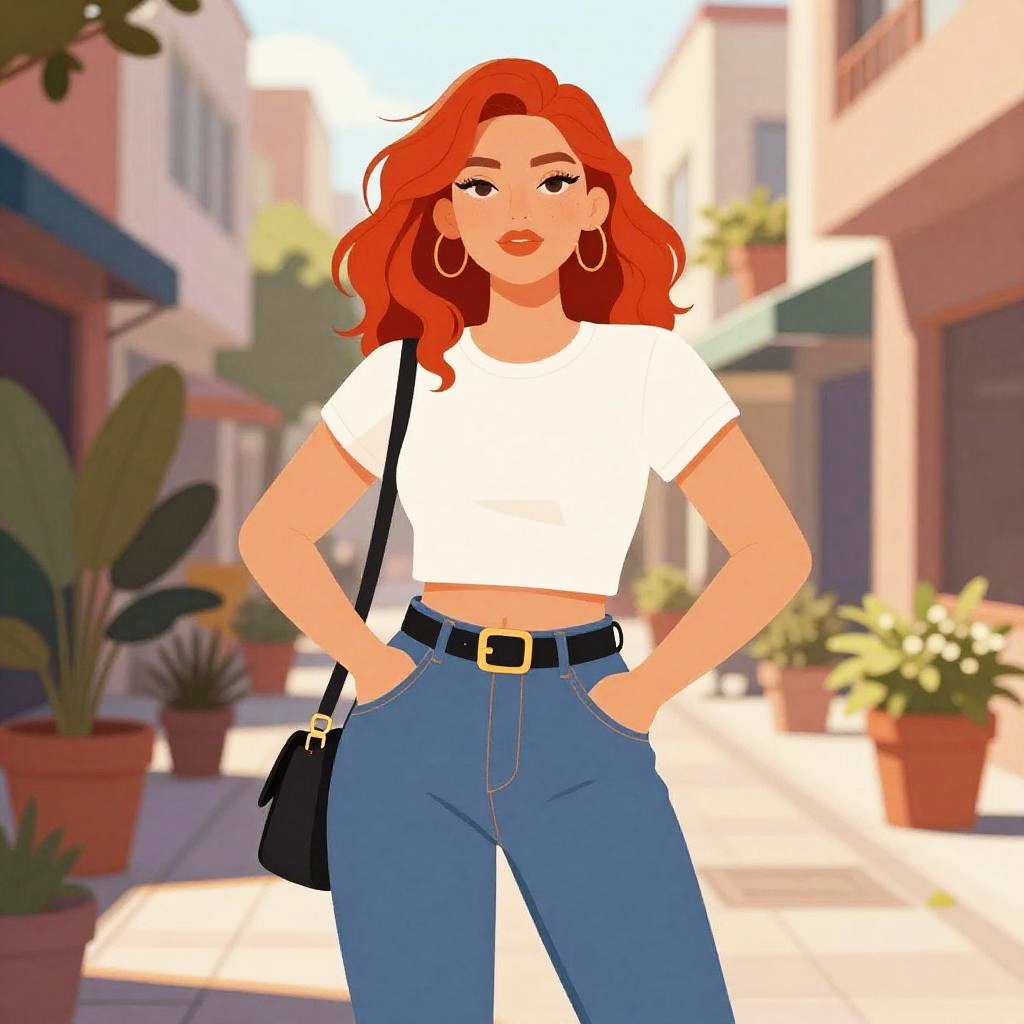A vibrant, stylized illustration of a confident woman with striking red hair, standing in a sunlit urban setting. Her casual attire and confident pose exude a sense of modern lifestyle and individuality, surrounded by potted plants and warm colors that evoke a lively atmosphere.