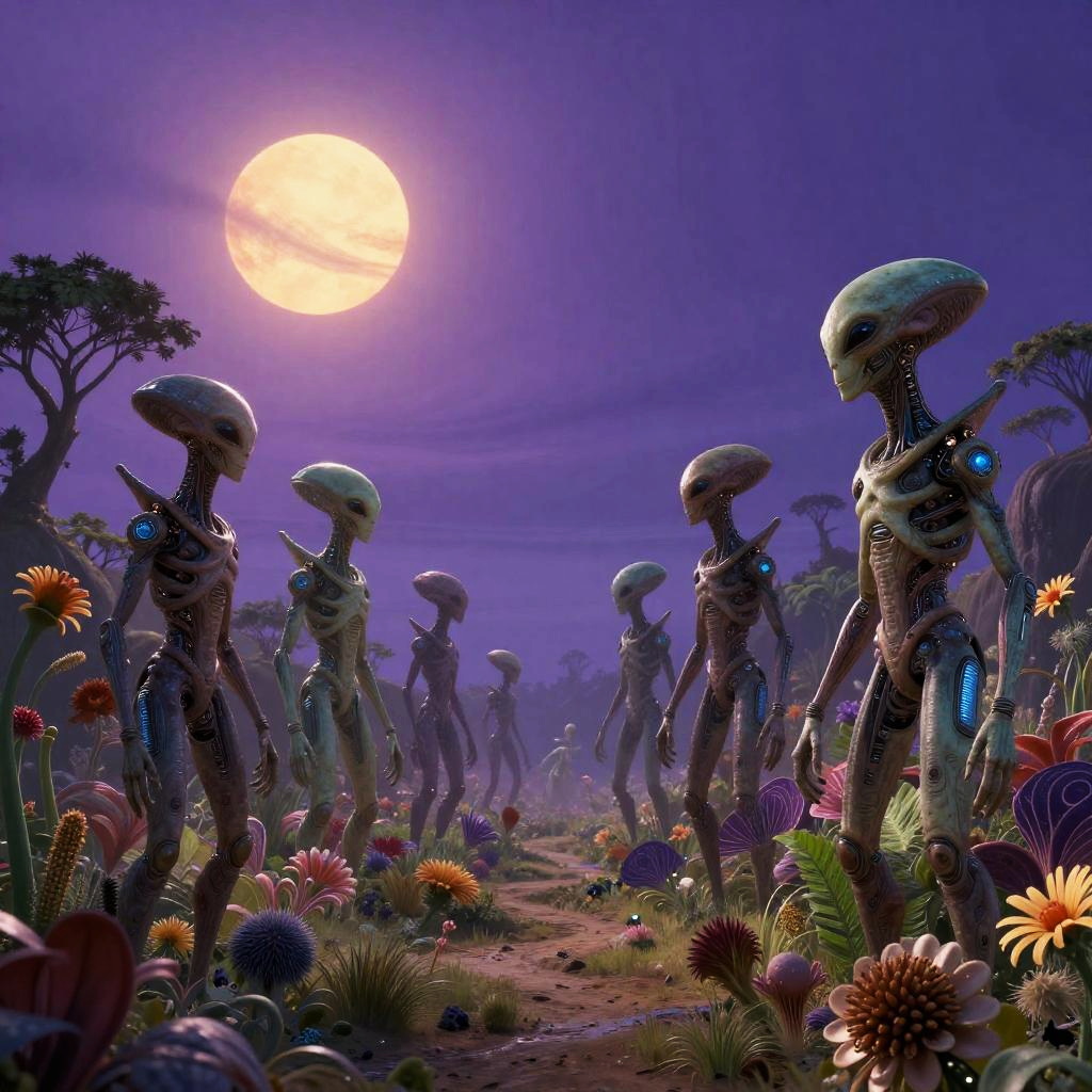 Alien AI art portraying a serene alien landscape inhabited by AI-driven extraterrestrial beings, combining organic flora with cybernetic enhancements, under twin suns and swirling purple skies, with a blend of natural and synthetic aesthetics, richly textured and visually immersive