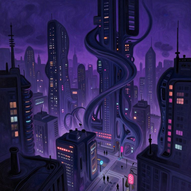 In an avant-garde surrealist cityscape painting, envision a 'bug's-eye view' of a futuristic metropolis where towering structures twist and contort under the influence of time-space anomalies. This otherworldly scene should provoke both intrigue and discomfort as buildings merge into liquid-like forms, their geometry dissolving into dreamlike shapes. Neon lights flicker across distorted streets and alleys, casting spectral shadows that dance with the warped architecture below. The color palette shifts from deep indigo to electric violet, mirroring the city's surrealistic essence juxtaposed against the technological sophistication of its inhabitants.