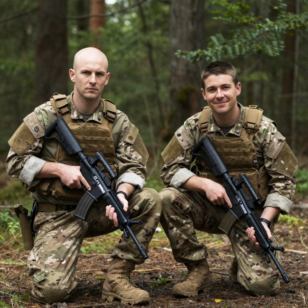 Photograph of three male soldiers standing in front of a military helicopter. All three wear green camouflage uniforms with tactical vests. Soldier on the left has short dark hair, arms crossed, serious expression. Center soldier with shaved head, slight smile, hands on vest. Right soldier with light brown hair, mustache, hands on vest. Clear blue sky background. Soldier on the right has a prominent mustache and serious expression. Helicopter partially visible on the left.