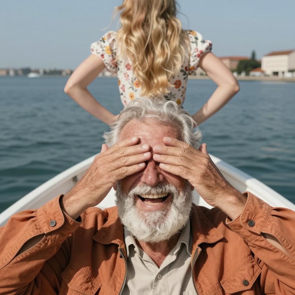 Old man with white beard and mustache, laughing, hands covering eyes, wearing orange jacket, seated on boat. Young woman with long blonde hair, wearing floral dress, standing on boat, facing away, hands on hips. Blue water, buildings in background. Bright sunlight. Two people. Close-up of man in foreground, woman in background.