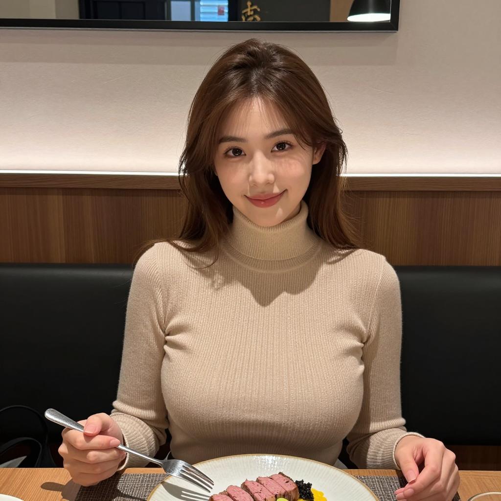 Photograph of a woman with long blonde hair, wearing a black headband and black coat, sitting at a dimly lit restaurant table. She looks down with a slight smile, holding a fork in her right hand. A white plate with food and a spoon is in front of her. A tall, dark plant is in the background. Another person's arm is partially visible on the right.