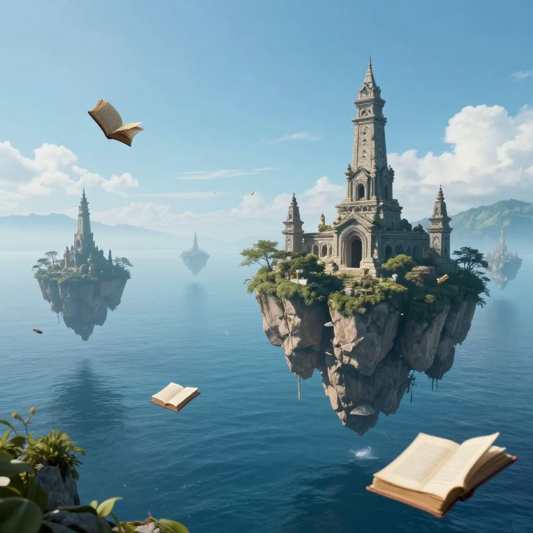 An ethereal archipelago of floating islands cradles ancient stone structures, their silent towers reaching toward the heavens, while scattered volumes of knowledge drift like dreams upon the azure sea, inviting introspection amidst the boundless expanse of mystery and wonder.