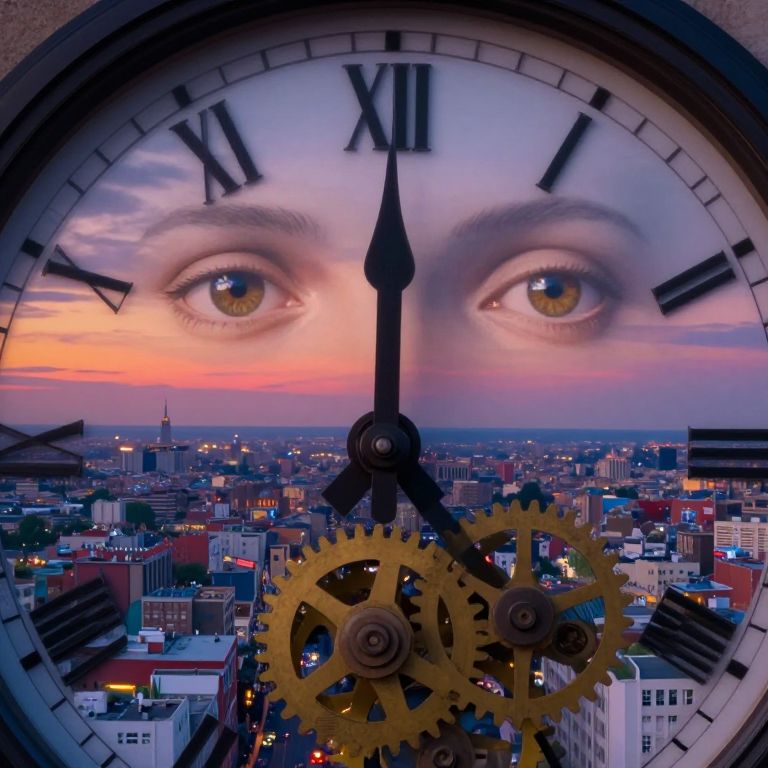 Picture a mesmerizing, surreal landscape where a colossal clock face is replaced by an enigmatic mirror-like surface reflecting the bustling metropolis below. From a high vantage point, this dynamic view showcases an expansive urban expanse filled with towering skyscrapers and vibrant streets. In the foreground, a lone figure stands motionless before the reflective timepiece, their distorted reflection morphing into various animals and mythical beings as they engage with the seemingly endless city life unfolding around them. This evocative image captures a sense of introspection and wonderment, intertwining the abstract notion of time with the vivid reality of urban existence in a thought-provoking manner that is both hauntingly beautiful and emotionally resonant.