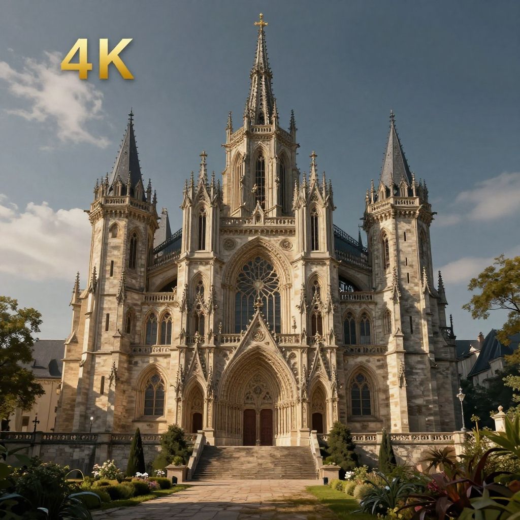 Photograph of a grand Gothic-style cathedral with intricate stone carvings, tall spires, and large arched windows. The building's facade is illuminated by sunlight, highlighting the detailed stonework. A central rose window and ornate doorway are prominent. The cathedral is surrounded by a well-maintained garden with trees and shrubs. The sky above is clear with a few clouds. The top left corner features a gold "4K" label, indicating high-definition quality. The foreground includes a stone pathway leading up to the steps of the cathedral.