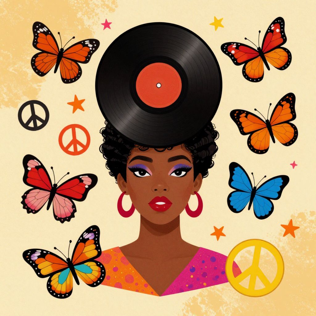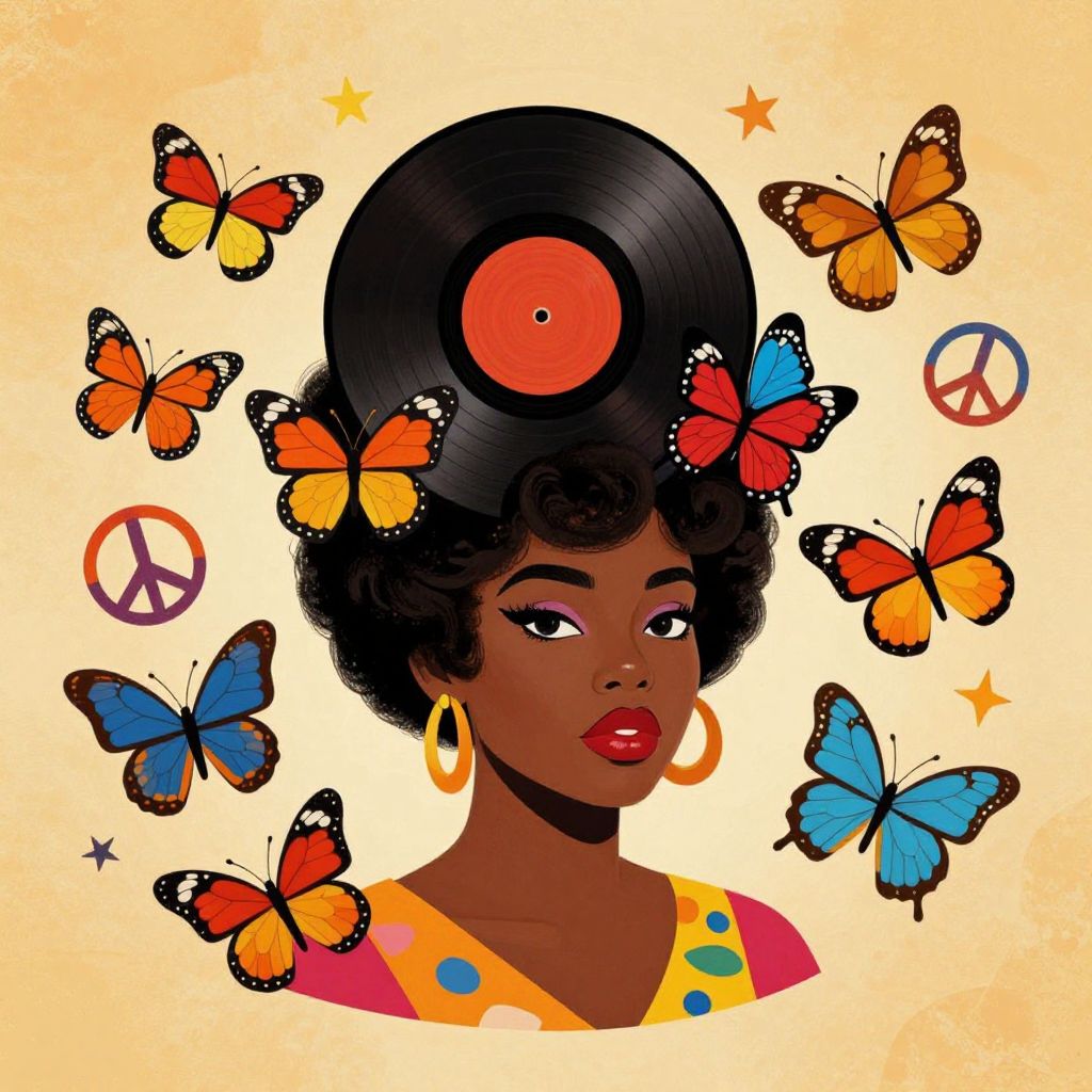Vibrant illustration captures the essence of 1960s soul and funk music through a young Black woman with hair styled as a vinyl record, surrounded by ten colorful butterflies in shades of red, orange, blue, and yellow, alongside scattered peace symbols and stars against a warm, textured background.