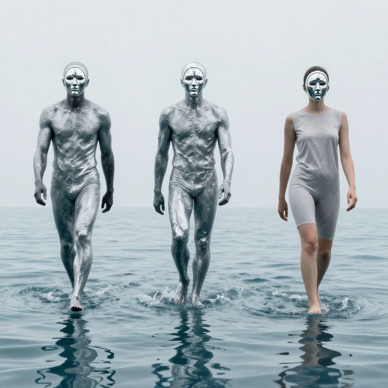Photographic surrealism: Three figures—two male, one female—wearing metallic, silver body paint, walking barefoot in reflective water; woman