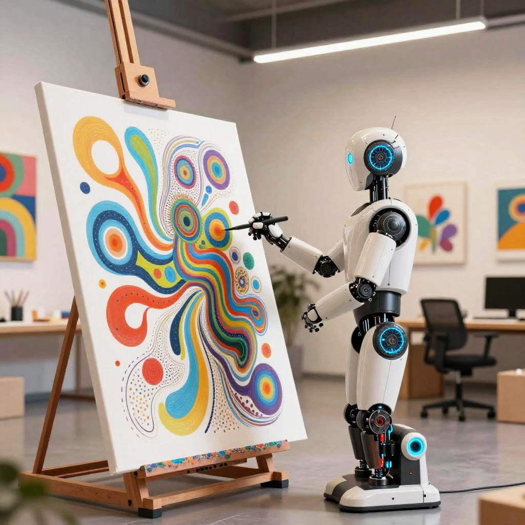 Artificial intelligence to create images, robotic arm painting on canvas with holographic brush, digital art fusion, abstract AI creativity, sleek modern lab setting, bright luminous effects, intricate textures and vivid colors
