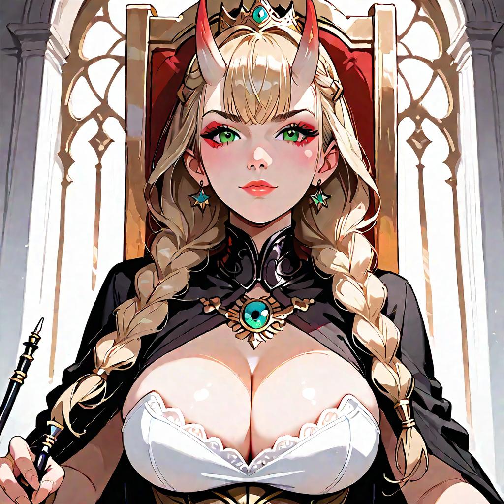 Digital artwork of a sexy, light-skinned female anime character with long, platinum blonde hair in braids, adorned with black horn-like accessories. She has large blue eyes, full red lips, and a curvy figure with large breasts. She wears a black, strapless, cleavage-revealing top with a white lace trim, a short, pleated black skirt, fishnet gloves, and black thigh-high stockings. Her confident pose is accentuated by her slightly bent knee and one hand on her hip. The background is white, making her vibrant colors pop. The art style is highly detailed and dynamic, with bold lines and bright colors.