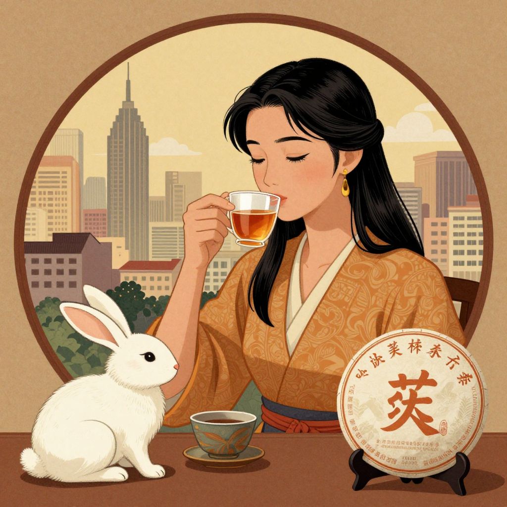 A hyper-detailed, cityscape shot featuring a young Chinese woman, resembling Annie Q., drinking tea in a warm, Enki Bilal graphic novel style, with a rabbit, pu-erh tea cake, and a round frame.