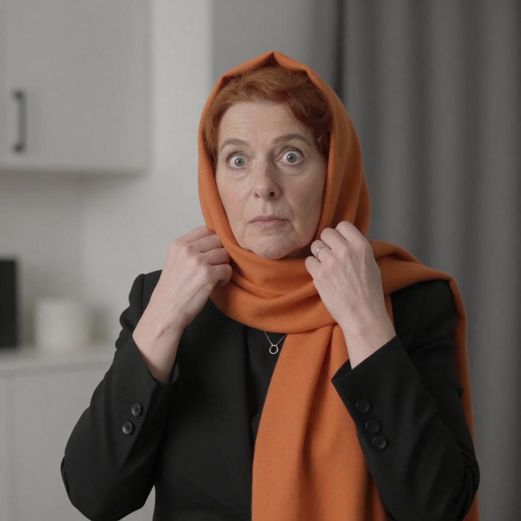Middle-aged woman with red hair, wide-eyed expression, wearing black suit, orange scarf wrapped around head, holding scarf with both hands, seated indoors, white cabinets and gray curtains in background.
