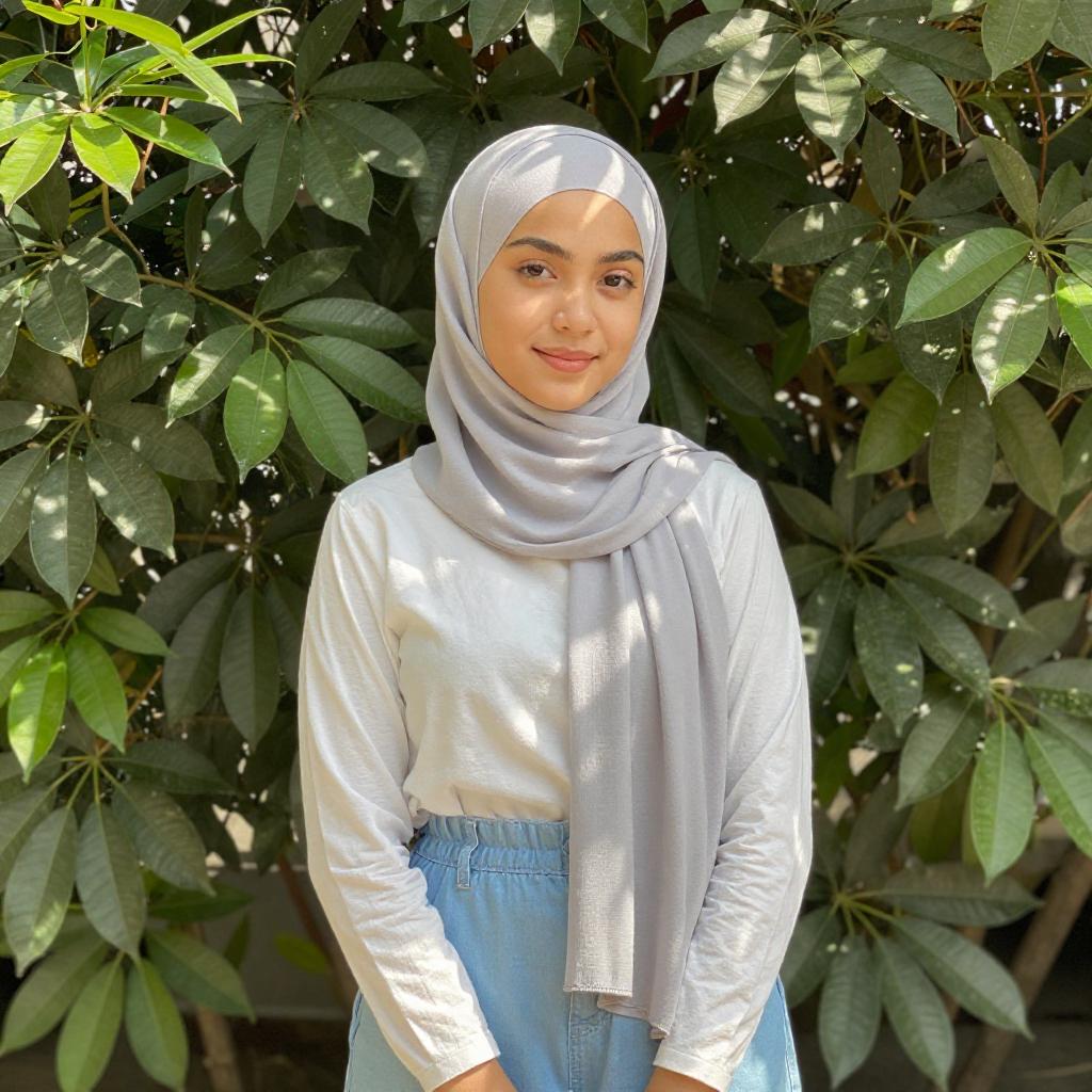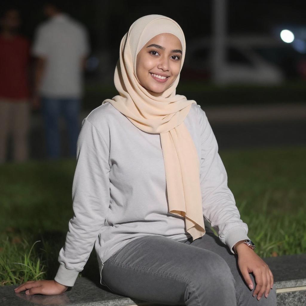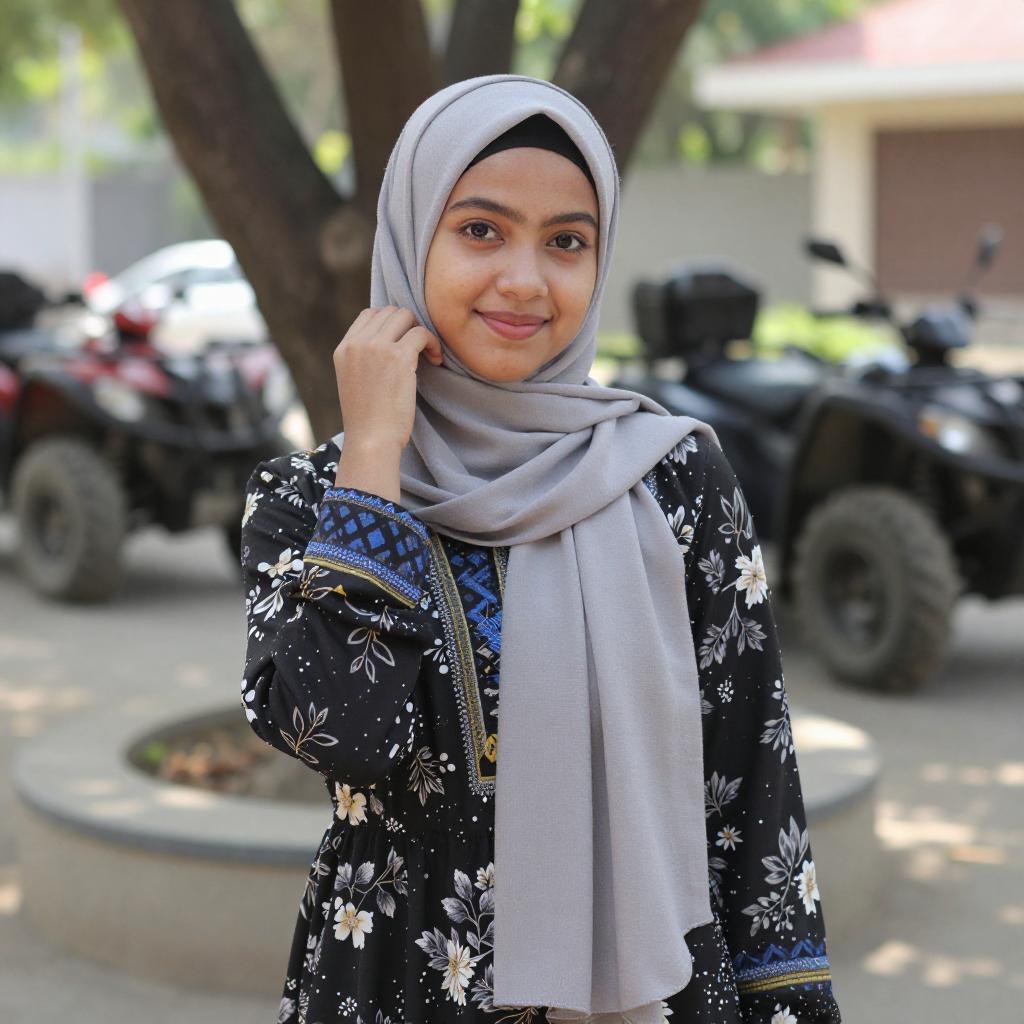 Photograph of a smiling young woman with light brown skin and dark eyes, wearing a beige hijab, black long-sleeve top with pink floral patterns, and black pants. She has sunglasses on her head and stands outdoors on a sandy area with trees and a blurred building in the background.