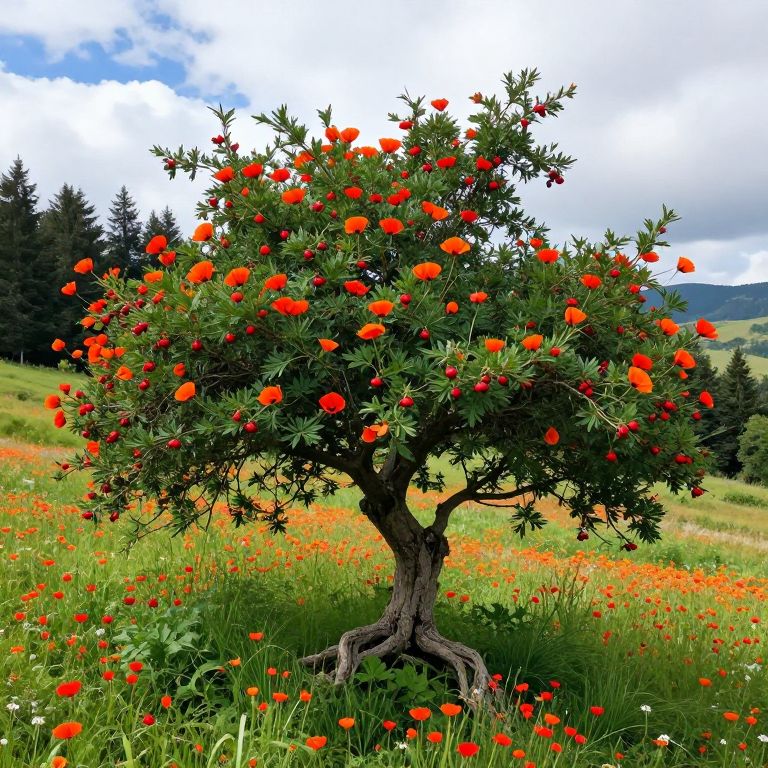 Photograph of a vibrant orange poppy tree with bright red flowers, rooted in a lush green meadow, under a partly cloudy sky with distant ever