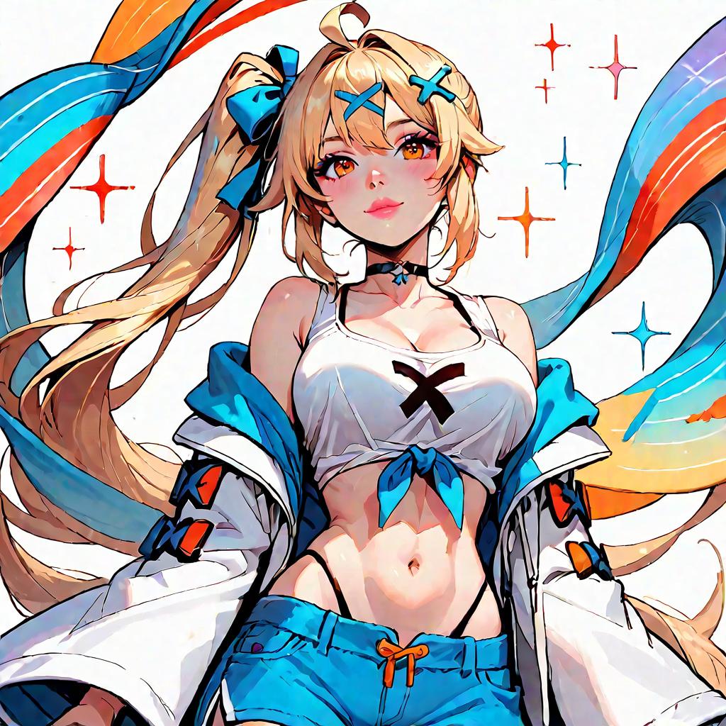 Score_9, score_8_up, score_7_up, source_anime, pinup of cute 1girl, solo, joyful, smile, very long hair, blonde hair, side ponytail, bangs, hair ribbon, ahoge, x hair ornament, heterochromia, red eyes, orange eyes, large breasts, white tank top, front-tie top, bare shoulders, white jacket, wide sleeves, open jacket, sleeves past fingers, blue shorts, navel, midriff, collarbone, choker, highleg panties