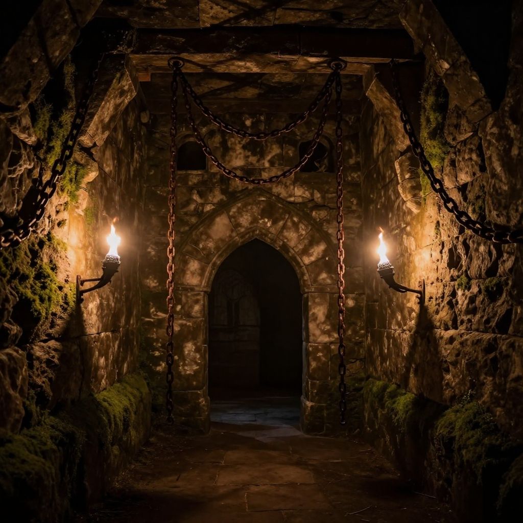 Inside castle dungeon dimly lit with flickering torches, ancient stone walls covered in moss, rusty iron chains hanging, spooky shadows, eerie atmosphere, medieval fantasy style