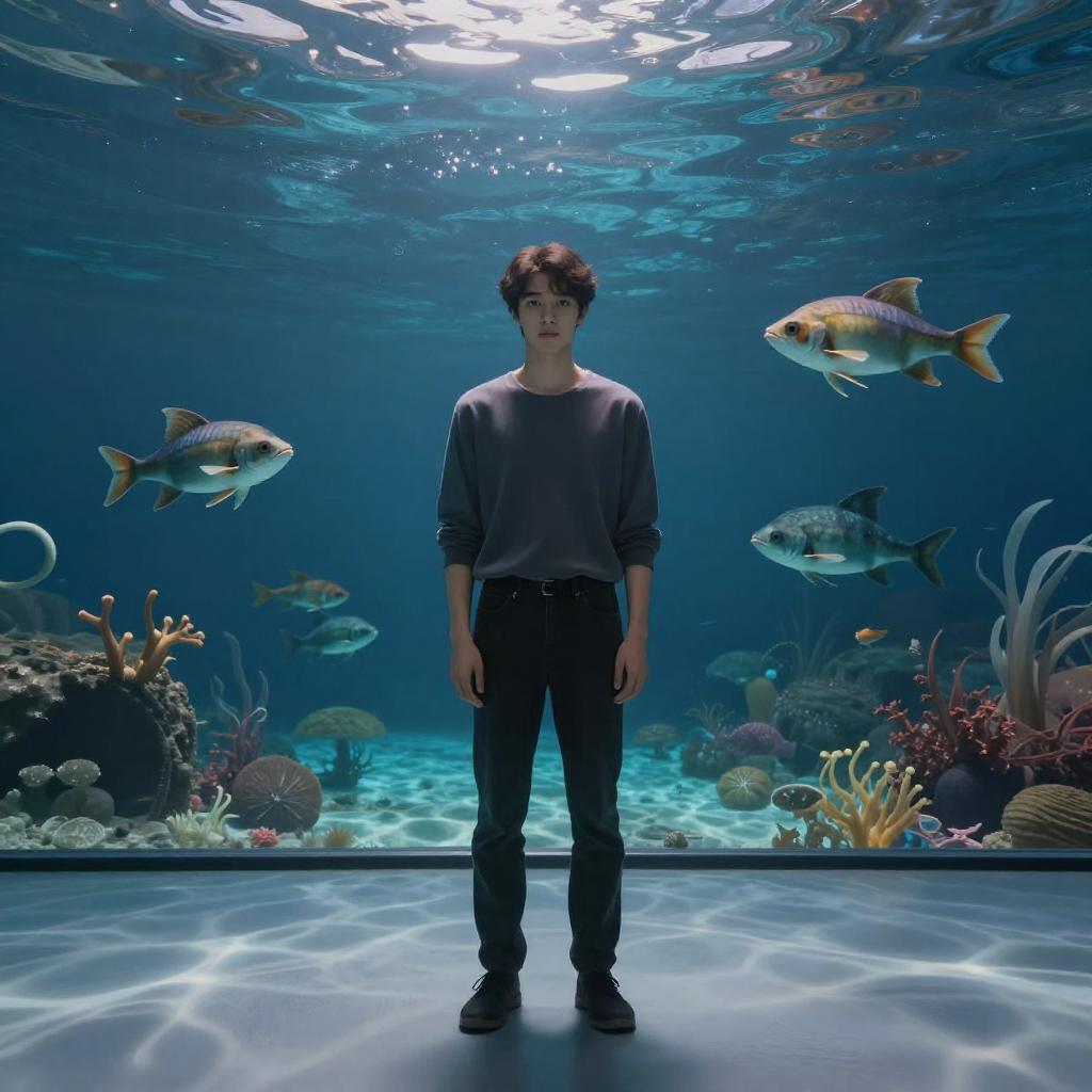 A young man stands in a minimalistic room that appears to morph into a surreal underwater world. The scene features realistic water reflections on the floor and sea creatures like colorful fish and coral surrounding him. The digital art style uses rich blue tones to create an immersive aquatic atmosphere.