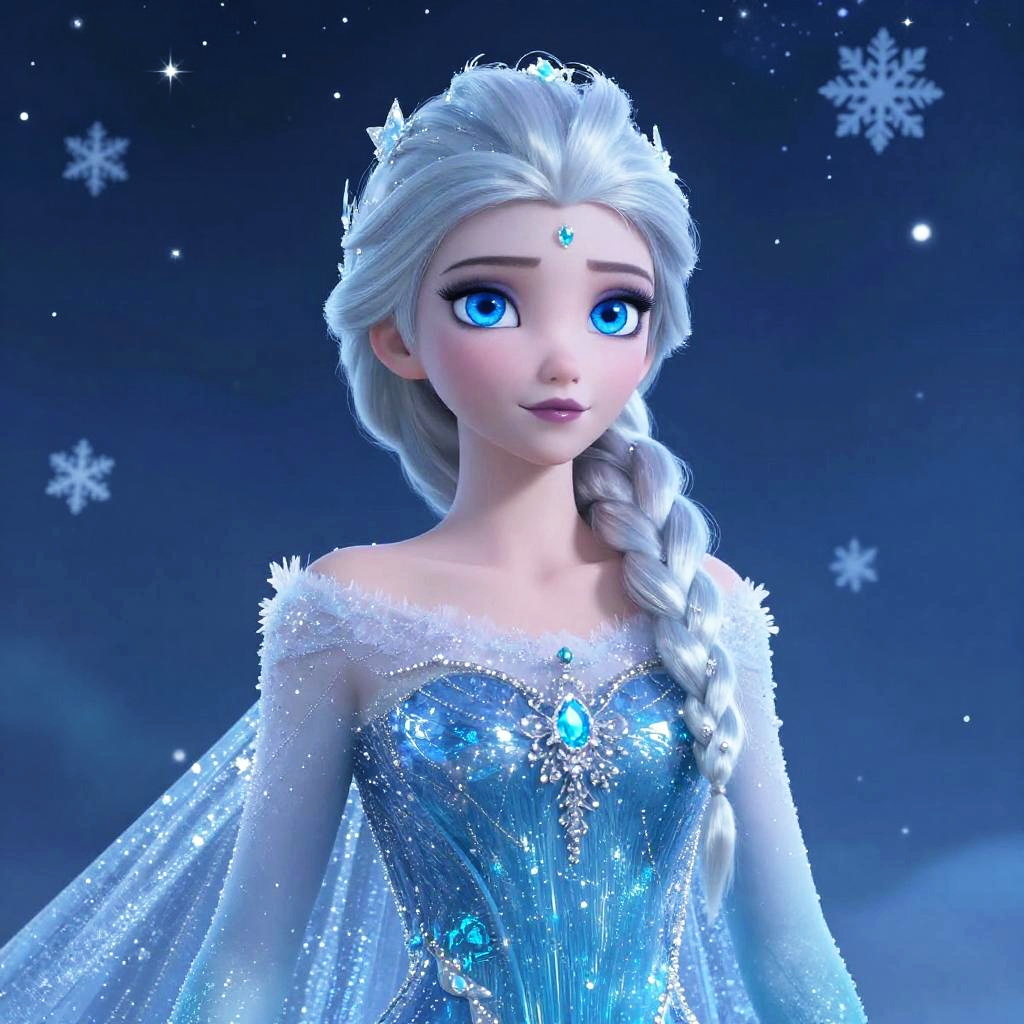 Digital art of Elsa from Frozen with vibrant blue eyes, silver braid, sparkling ice-blue gown, snowflake background, and starry night sky.