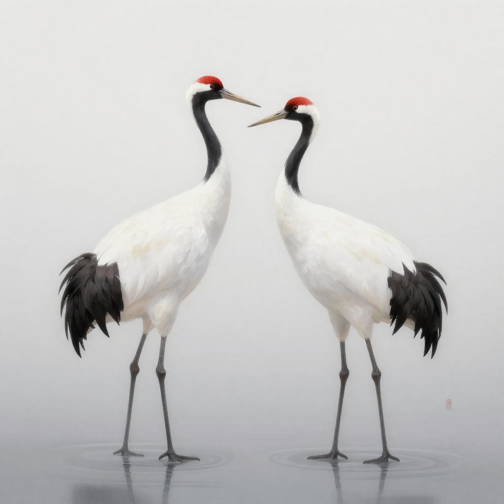 Male and female cranes depicted as a minimalist pencil drawing, simple and elegant.