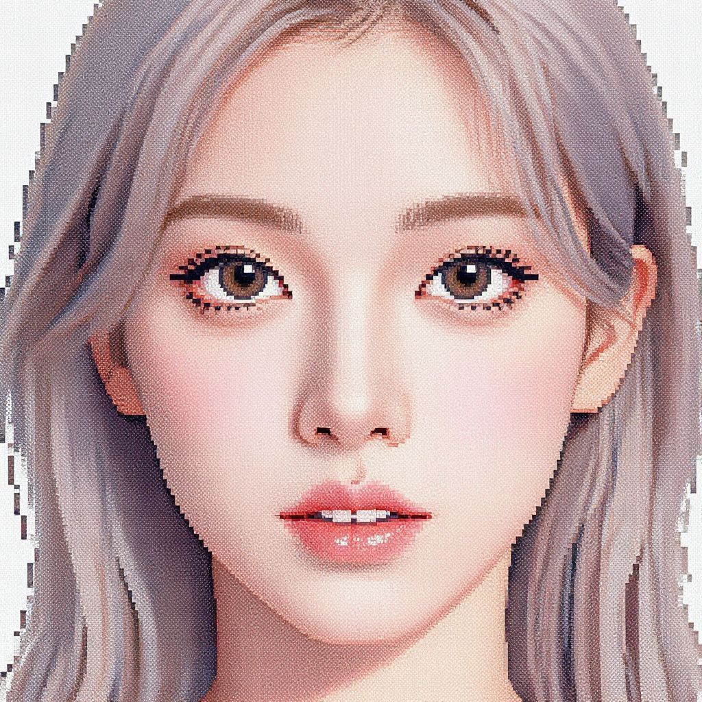 Digital pixel art portrait of a young Asian woman with long, silver-gray hair, fair skin, large brown eyes, and soft pink lips.