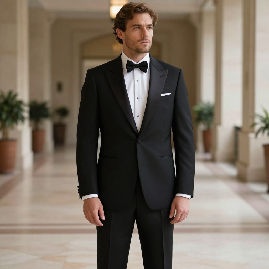 Male Costume Suit, image of a man in a tuxedo standing in a hall