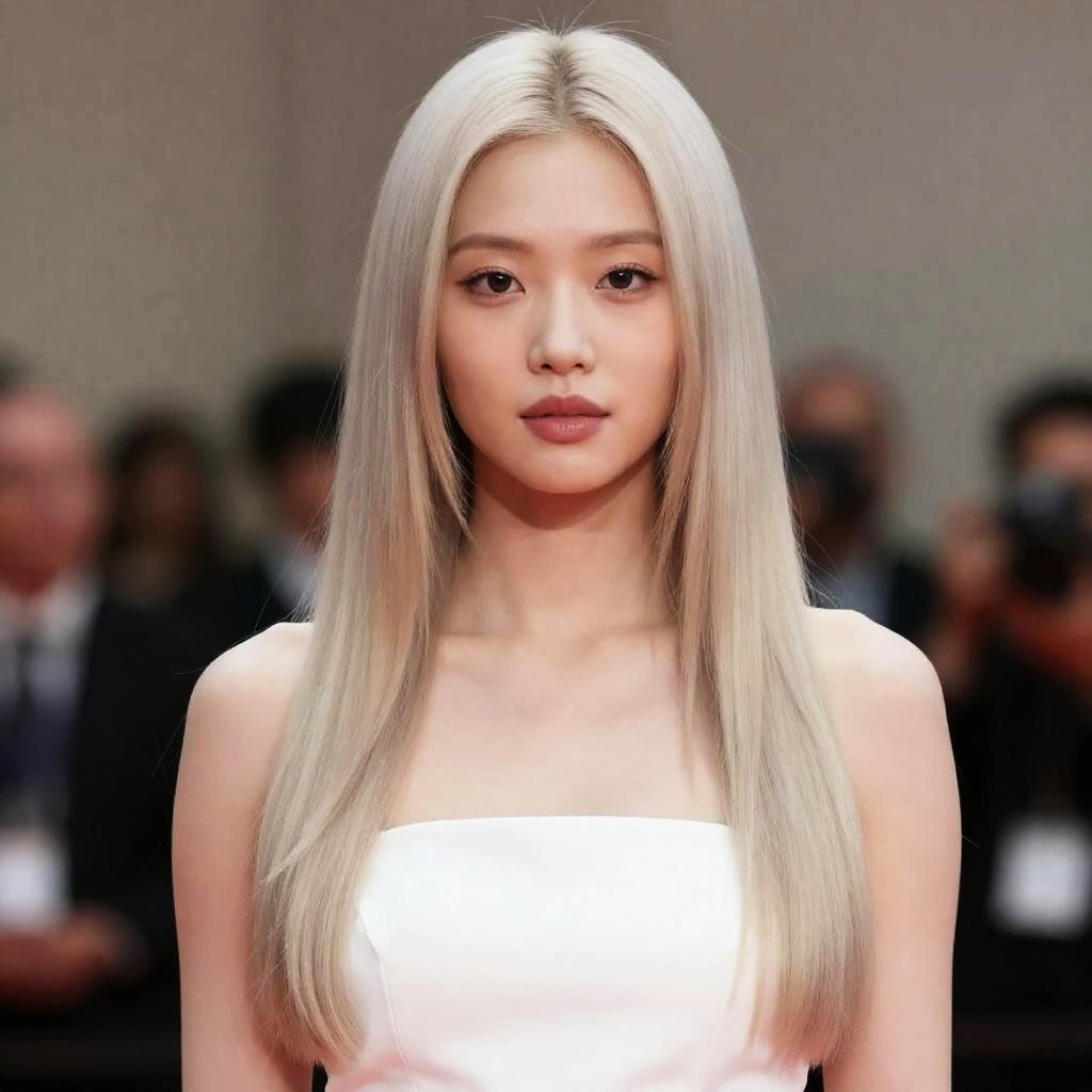 Photorealistic image of an Asian woman with long straight platinum blonde hair wearing a white strapless dress. The woman has subtle makeup and a neutral expression, set against a softly blurred background with indistinct figures.