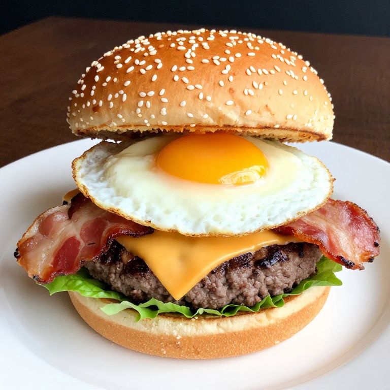 Golden sesame-topped bun crowns a classic bacon cheeseburger featuring a perfectly fried sunny-side-up egg, crisp bacon strips, melted cheddar cheese, fresh lettuce, and a juicy beef patty, all served on a pristine white plate at Spruce.