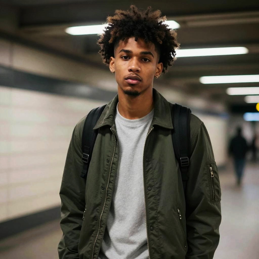 Drop Fade Afro hairstyle on male model, wearing athleisure wear, in underground metro station, captured in fashion editorial style with cool artificial light.