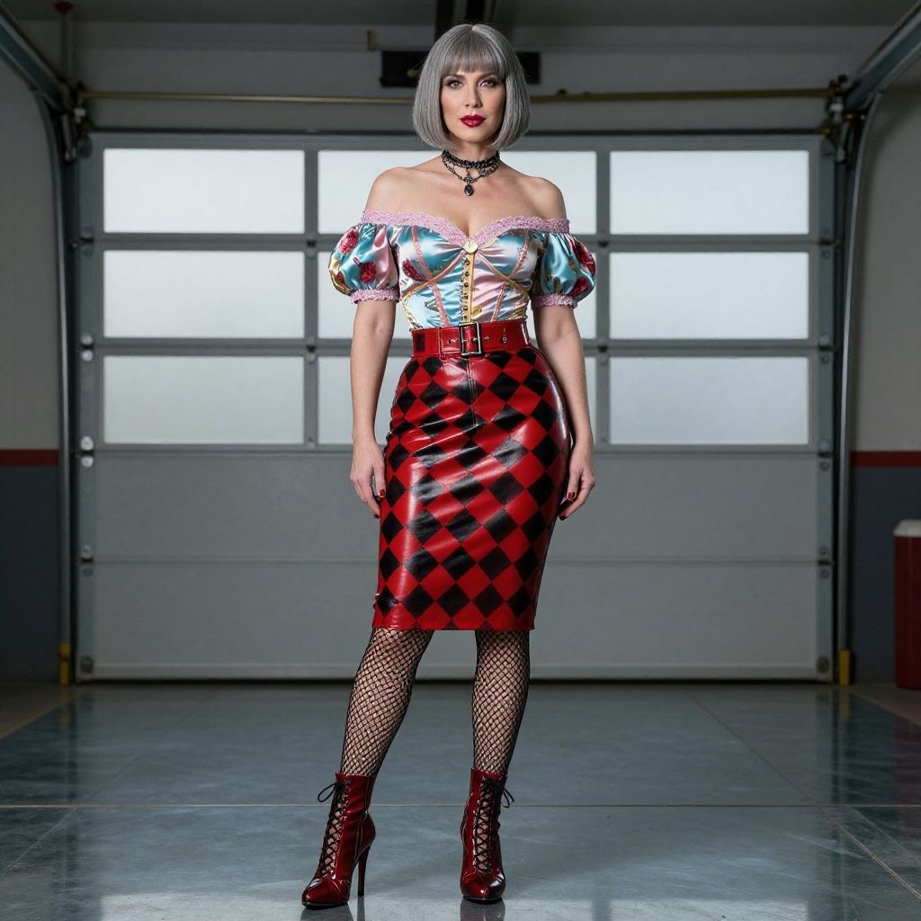 Full-length photo, beautiful 50-year-old short straight greyblonde bobcut woman, light blue light pink red gold off shoulder shiny satin flower patterned puff tight lace trim top., kinky short red black check satin trumpet pencil leather skirt with buckle belt, fishnet pantyhose in shiny leather lace-up high heel shoes boots, bright lipstick, gothic necklace choker, stood inside garage, glass on floor, full body length, high quality, photorealism, cinematic, professional photo, 1064K, eye focus, superdetailed, filigree, haze, hyperrealism, masterpiece, Ultra HD