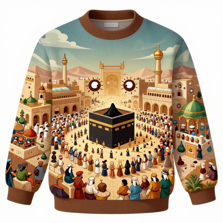 Digital illustration sweater depicting a bustling, colorful scene of a large mosque with a central black cube, surrounded by diverse, dressed worshippers under a vibrant,