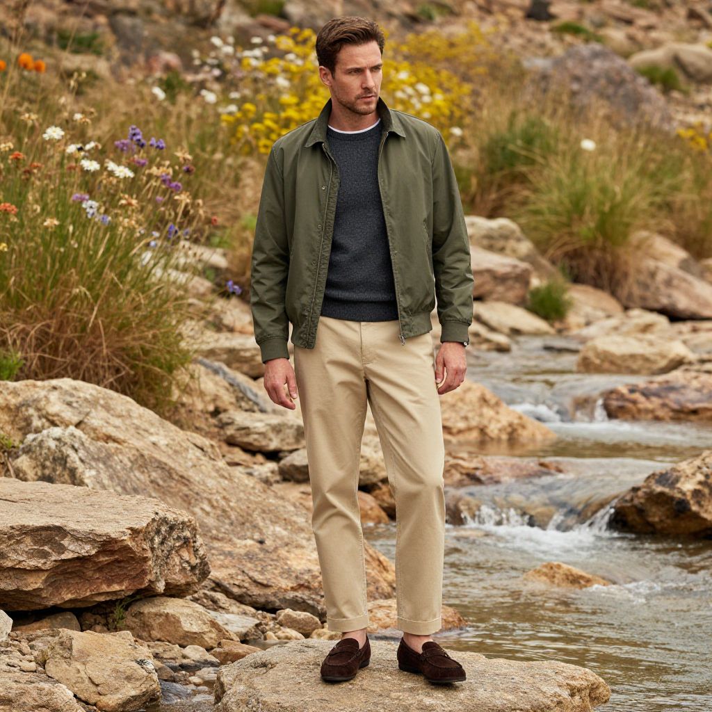 "a man, olive green waterproof bomber jacket, beige chinos, charcoal crew neck sweater, brown suede loafers, casual elegance, rocky riverbank, cascading water, vibrant wildflowers in bloom, soft focus, warm tones, contemplative expression. Man has masculine face and piercing eyes"