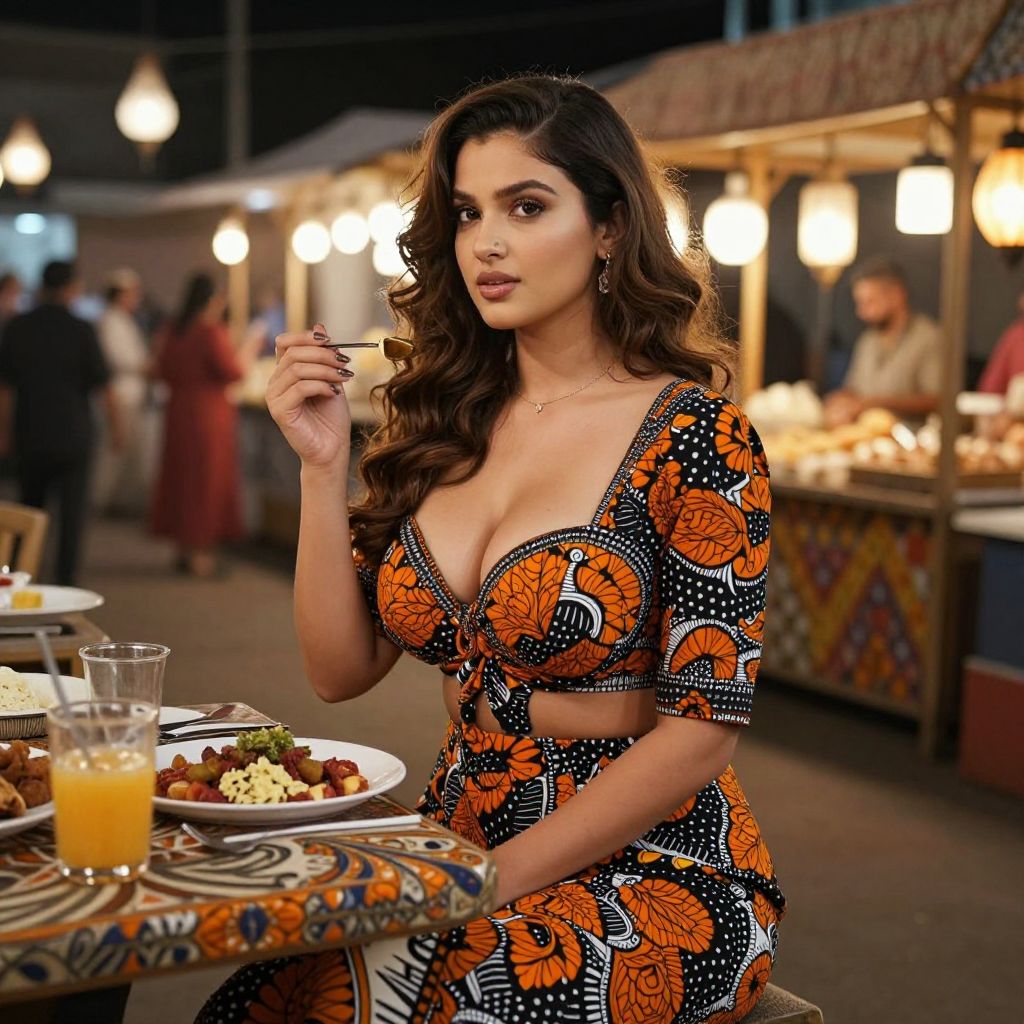 Photograph of a curvy woman with long, wavy brown hair and medium skin tone, sitting at an outdoor market stall at night. She wears a low-cut, black and orange patterned dress with floral designs, highlighting her large breasts. She holds a fork with food, looking into the camera with a slightly pouty expression. In front of her, there's a table with a plate of mixed food and a glass of orange juice. The background features blurred market stalls with warm, hanging lights and people in the distance. The image has a vibrant, lively atmosphere.