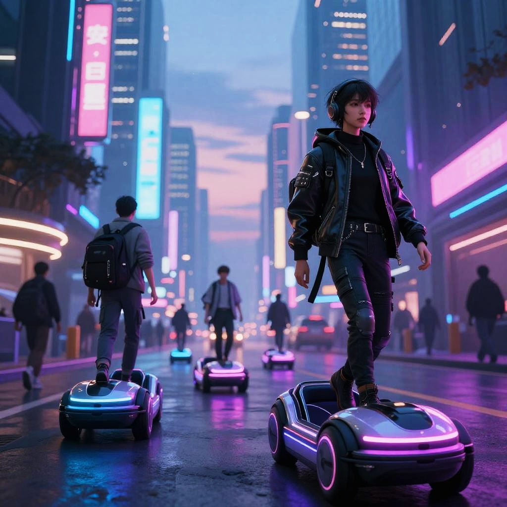 Anime-style depiction of a futuristic city at dusk featuring neon-lit skyscrapers and sleek hovercars. Several characters dressed in stylish cyberpunk outfits walk and ride hoverboards on wet streets reflecting vibrant blues, purples, and pinks. The atmosphere is vivid and bustling.