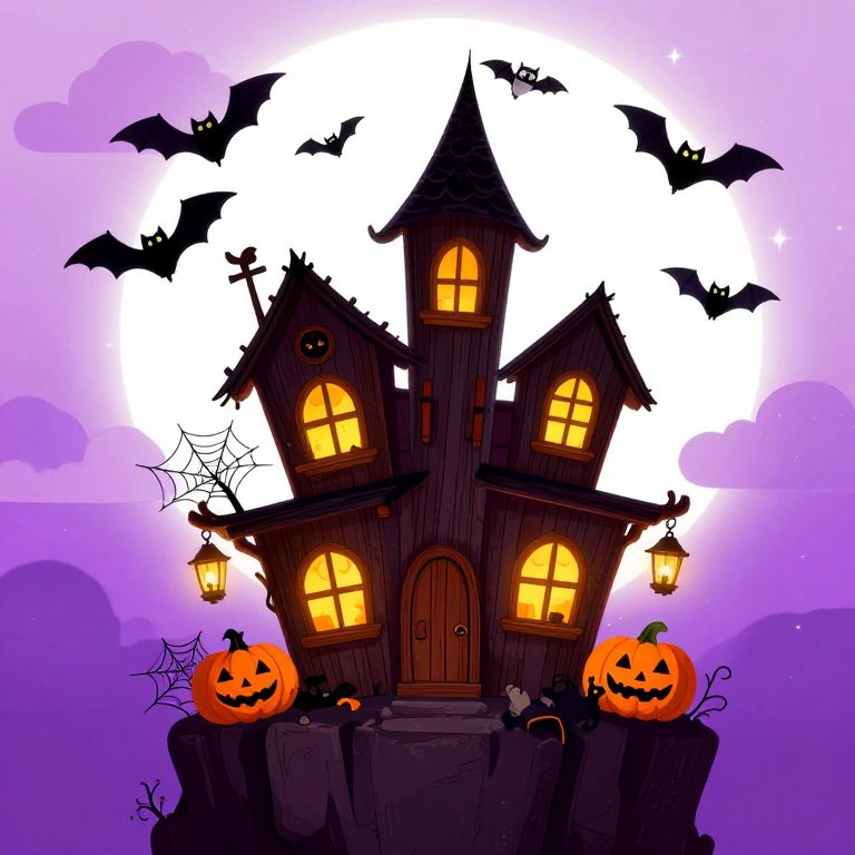 Digital illustration of a spooky, dark wooden haunted house with a pointed roof and glowing yellow windows against a bright full moon. Six black bats fly around the moon, and two carved jack-o'-lanterns with smiling faces sit on either side of the stone steps leading to the house. A spiderweb hangs from the left side, and a small black cat peeks out from the bottom right. The background is a gradient of purple and white, enhancing the eerie, Halloween atmosphere. The overall style is cartoonish and vibrant.