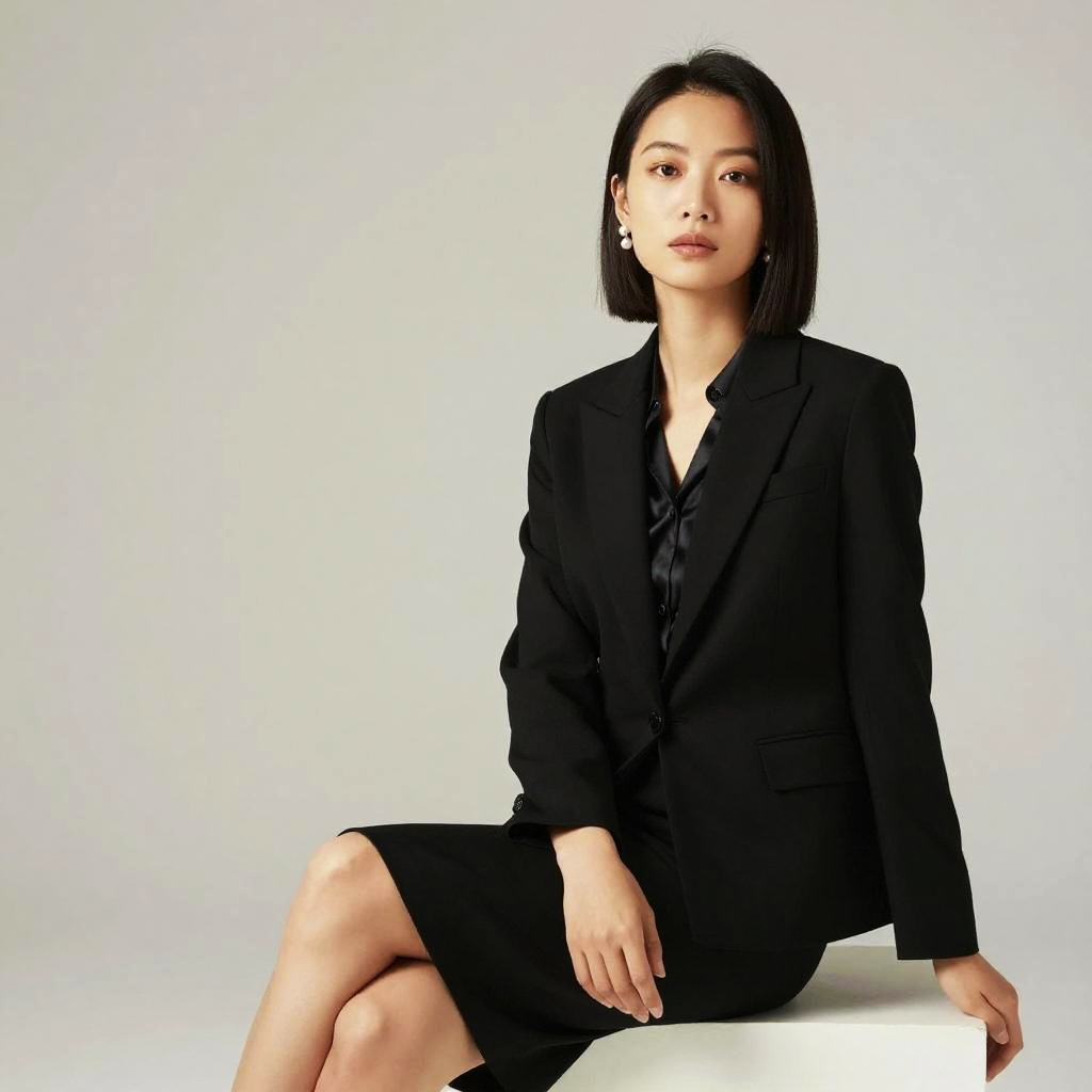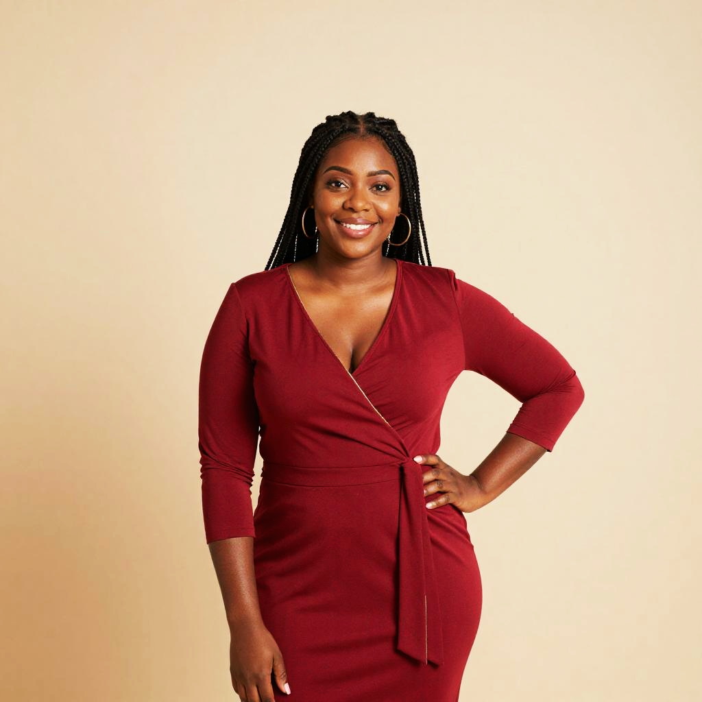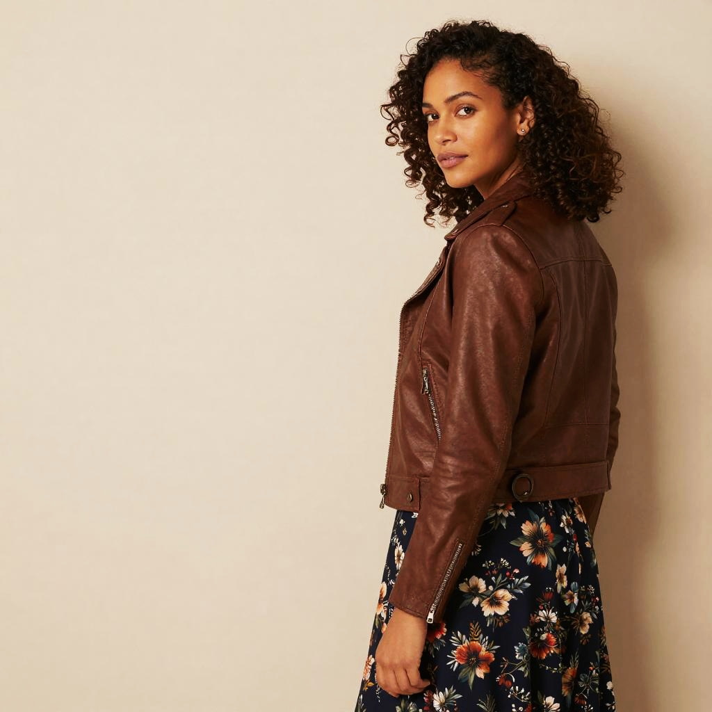 Wide shot, medium height woman with warm caramel skin and curly shoulder-length hair, chic leather jacket over a floral midi dress, leaning against a wall looking over shoulder, tiny stud earrings, simple background