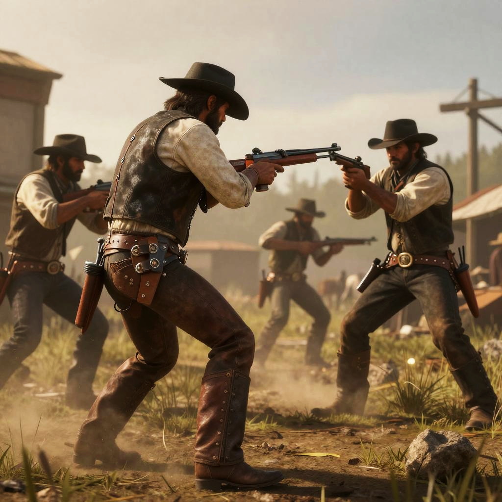 Digital art: Four armed cowboys in vests and hats, firing rifles in a dusty, sunlit Western town with buildings and grass.