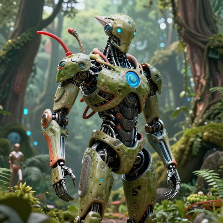 Character AI design illustrating a biomechanical entity with organic and mechanical elements intertwined, standing in a futuristic forest where technology and nature coexist, rendered with intricate textures and vibrant colors.