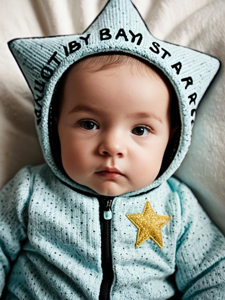 Infant in Baby Star Costume, close-up detailed baby headshot, photorealistic realism