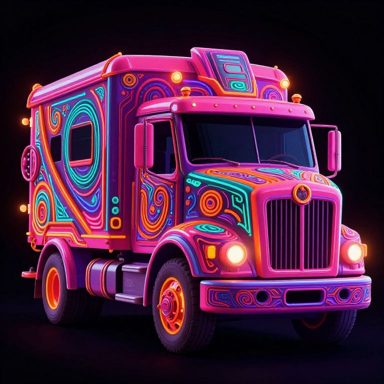 The image showcases an abstract design of a steampunk truck, adorned with vibrant neon colors that create a striking visual impact. The truck's front features intricate, swirling patterns in shades of pink, purple, and orange, with a prominent grill and headlights that glow with a soft, warm light. The body of the truck is covered in a complex network of green and blue patterns, giving it a futuristic, otherworldly appearance. The wheels are detailed with red and yellow accents, adding to the dynamic and energetic feel of the design. The truck's overall composition is balanced, with the patterns and colors creating a sense of movement and depth. The interplay of neon colors and the detailed textures of the patterns make the truck appear both fantastical and technologically advanced, capturing the essence of steampunk aesthetics in a visually captivating manner.